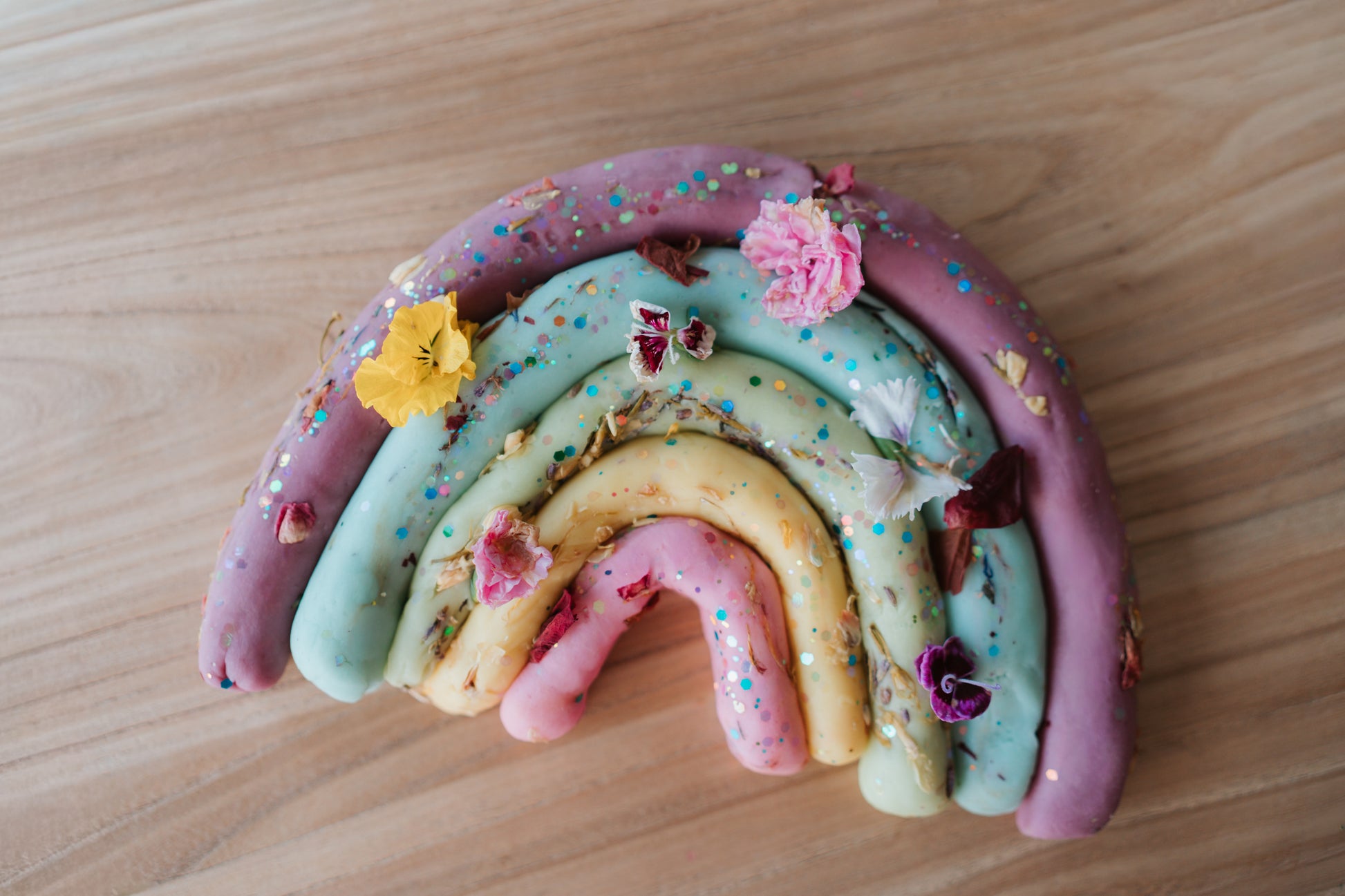 Made from natural ingredients and coloured with plant-based dyes, each batch is infused with dried flowers, biodegradable glitter and essential oils for a whimsical, earthy charm.